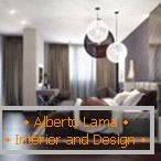 V obývacej izbe nájdete svetlé záclony, elegantný načechraný koberec, hrubú vrstvenú pohovku. V strede tejto svetlej kompozície sú brutálny konferenčný stolík, lampa, tmavohnedá parketová doska.